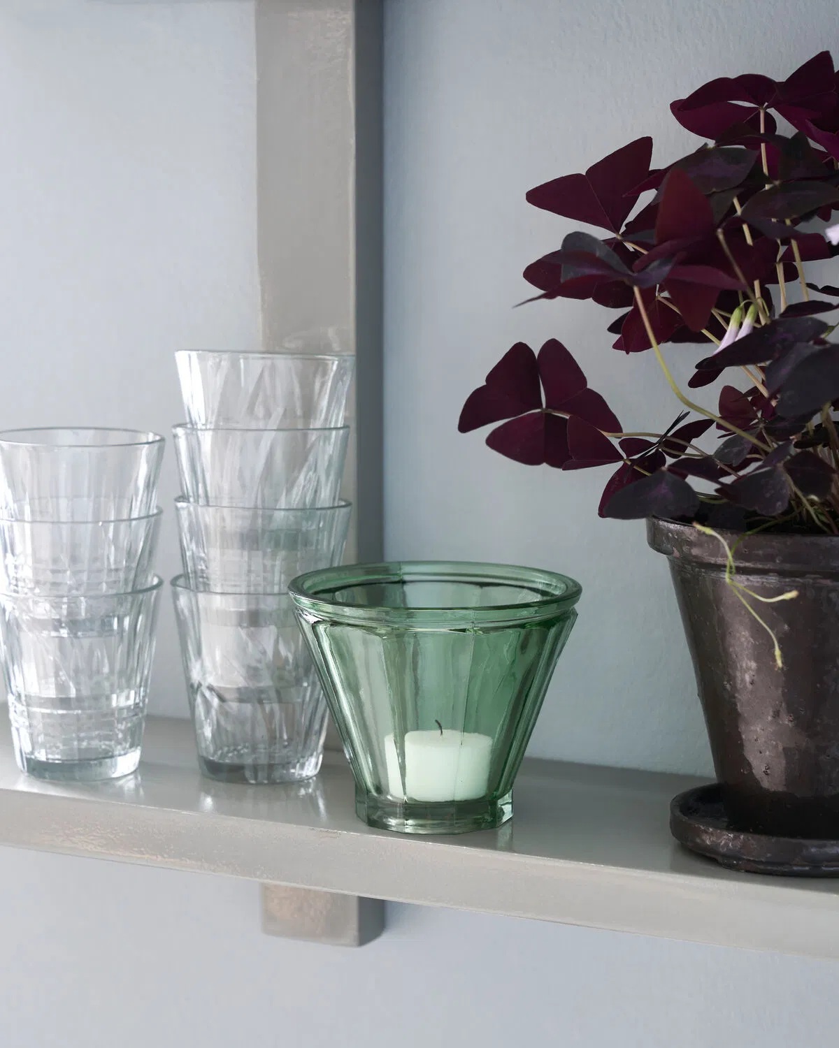 Deze handgemaakte theelichthouder van House Doctor, genaamd Fren, is geïnspireerd op vintage Franse jampotten. De charme zit hem in het geribbelde oppervlak en de verder eenvoudige uitstraling, die bij elke interieurstijl past. Hoewel het groene glas een zekere zwaarte heeft, oogt de theelichthouder van House Doctor licht en voegt hij een subtiele kleuraccent toe aan je interieur. Voor een complete en opvallende look kun je hem combineren met de kleinere variant.