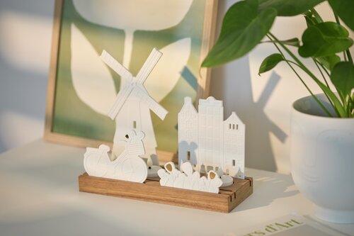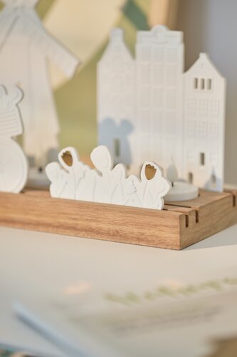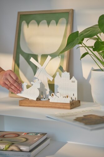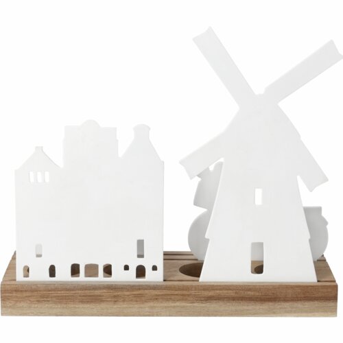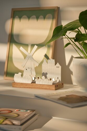 Een mooie waxinehouder met als afbeelding de Nederlandse skyline. De onderkant is hout en de objecten zijn gemaakt van porselein. Räder producten zijn handgemaakt.